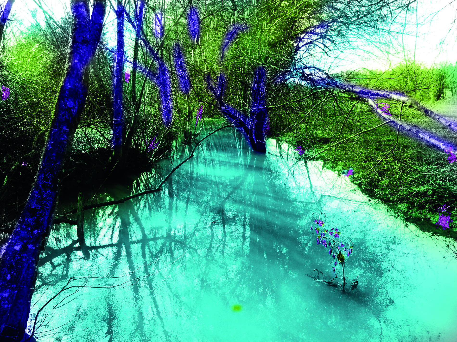 Her polymorphic artistic practice, initiated in 1975, is built around multiples (postcards, artist books, posters...), but also objects and installations. Her work brings imaginary places and mysterious intrigues to life, thus creating narratives reminiscent of fairy tales. It finely intertwines texts and photographic images, which are revisited and retouched, colorized without naturalism. Images of nature and enhanced settings, in which the human figure is always absent, are amplified by the juxtaposition of captions or titles parodying the genres of fantastic literature and noir novels. Through these means alone, her productions offer a grand voyage of the mind.