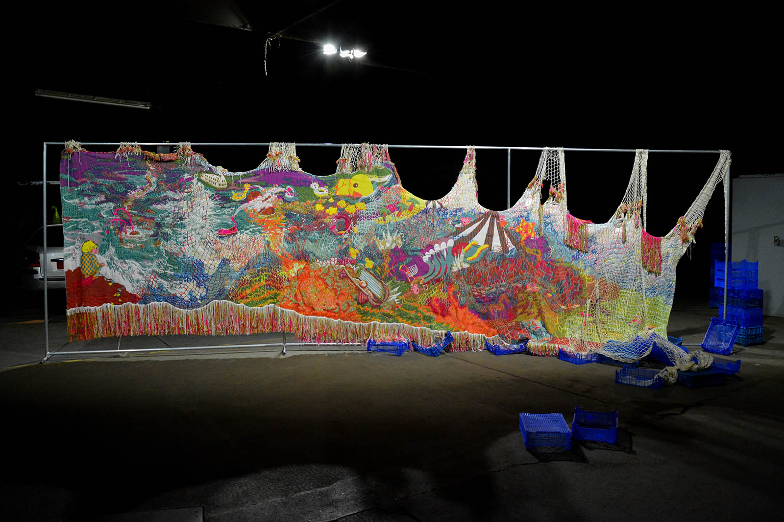 Tissage jacquard, filet de pêche, objets divers, métal, 800 x 100 x 230 cm