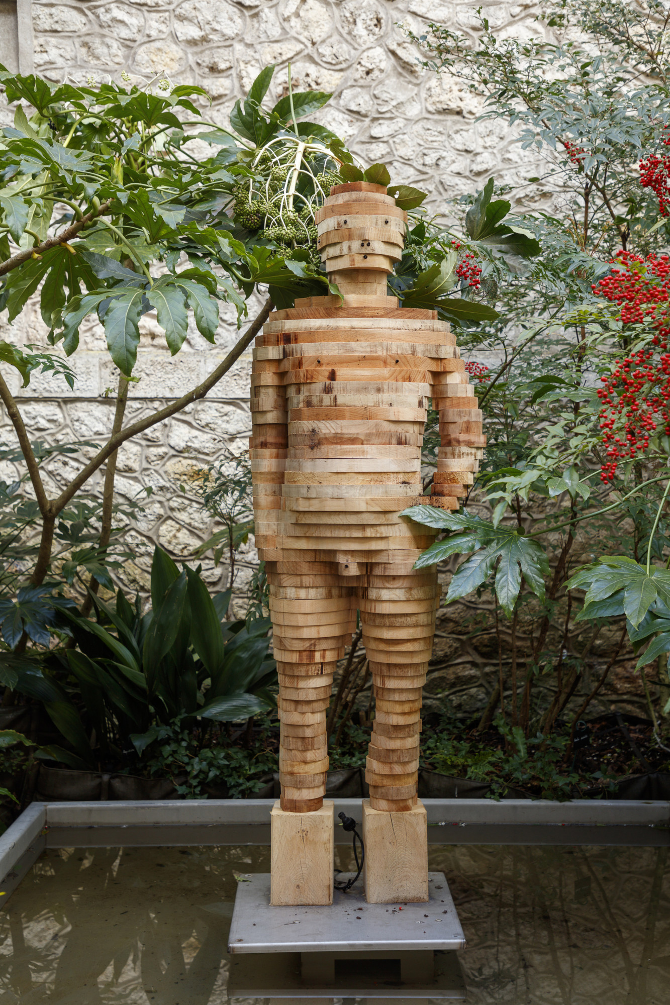 « En 1991 l’homme de Bessines est arrivé dans le village dont il porte le nom. Depuis il s’est propagé à travers le monde. Il s’est clôné de toutes les matières : du bronze à l’époxy, du polyester à la porcelaine, les dimensions varient également ainsi que le genre… il mute. Ici, ce sont les bois de La Vallée qui le compose, forêt que j’ai commencé à semer à la naissance de l’Homme de Bessines il y a plus de trente ans. L’homme de Bessines à Melle suinte et laisse apparaître peu à peu des mousses qui donneront la couleur verte originelle si les spores s’y accrochent. L’œuvre est éphémère. Elle existe juste le temps de se rendre compte de nos fragilités. »