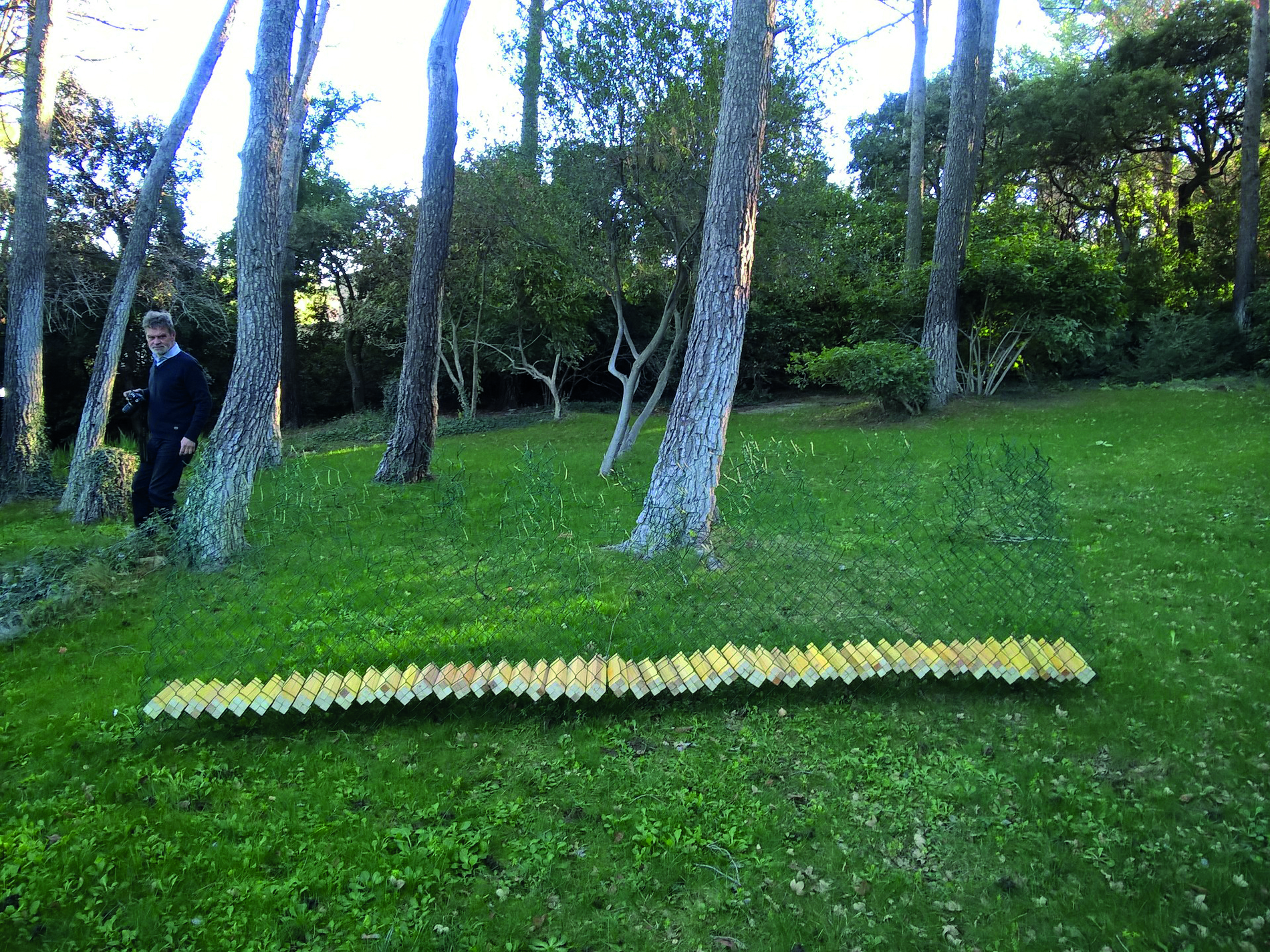 Le « grillage torsion simple à maille en losange » comme le nomment les catalogues des magasins de matériaux de construction, est omniprésent dans l’environnement urbain. Il est un des moyens les plus économiques pour enclore un espace sans avoir à construire des murs. Il faut toutefois sceller des piquets dans le sol entre lesquels le grillage va être tendu car il est souple et ses mailles sont « lâches », elles ne sont pas torsadées entre elles. Ce dernier détail est une caractéristique propre au “grillage torsion simple à maille en losange” qui me permet d’envisager un autre moyen de le rigidifier. Plutôt que d’utiliser un cadre extérieur fixé dans le sol, chaque maille est maintenue écartée en y introduisant un tasseau de bois ajusté à son format. Chaque maille est « tendue de l’intérieur » en quelque sorte. Cette tension répétée sur toute la longueur du grillage permet de rigidifier l’ensemble et de le dresser. Résultat, le grillage n’est pas fixé au sol, il ne peut plus avoir pour fonction de délimiter un terrain. Les tasseaux n’occupant que le bas du grillage, je peux défaire les mailles du haut et je laisse les fils de fer gainés de vert se courber comme des tiges végétales. Entremêlés, ils prennent alors des airs d’herbes folles. Le grillage devient une clôture buissonnière.