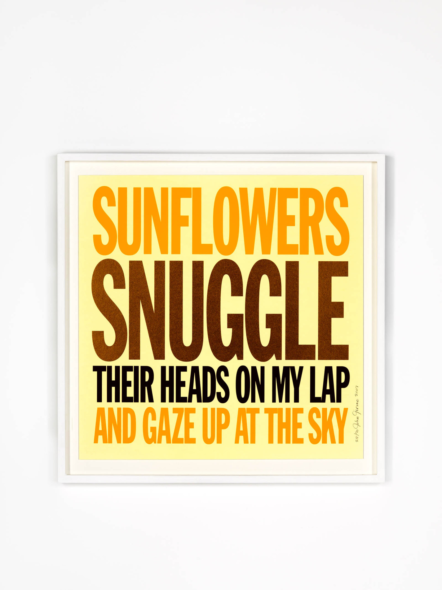 Welcoming the Flowers is a set of 18 silkscreens derived from the eponymous poem. The declarative phrases that compose each of them are precisely and identically laid out, in columns across multiple lines, justified right and left, similar to newspaper headlines. The words vary in size and color, vibrant or pastel, to emphasize certain ones. Some leap into view, while others require particular attention. John Giorno explores poetry through visual arts. "When you interpret them, you see which lines light up the audience. And then you say to yourself, 'Oh, that, that would work in a painting.'" These poems act as "visual megaphones." John Giorno painted his first Poem Painting in 1968. Brightly colored or rendered in watercolor, these visual poems appear staged like slogans, delivering the artist's declamatory voice.
