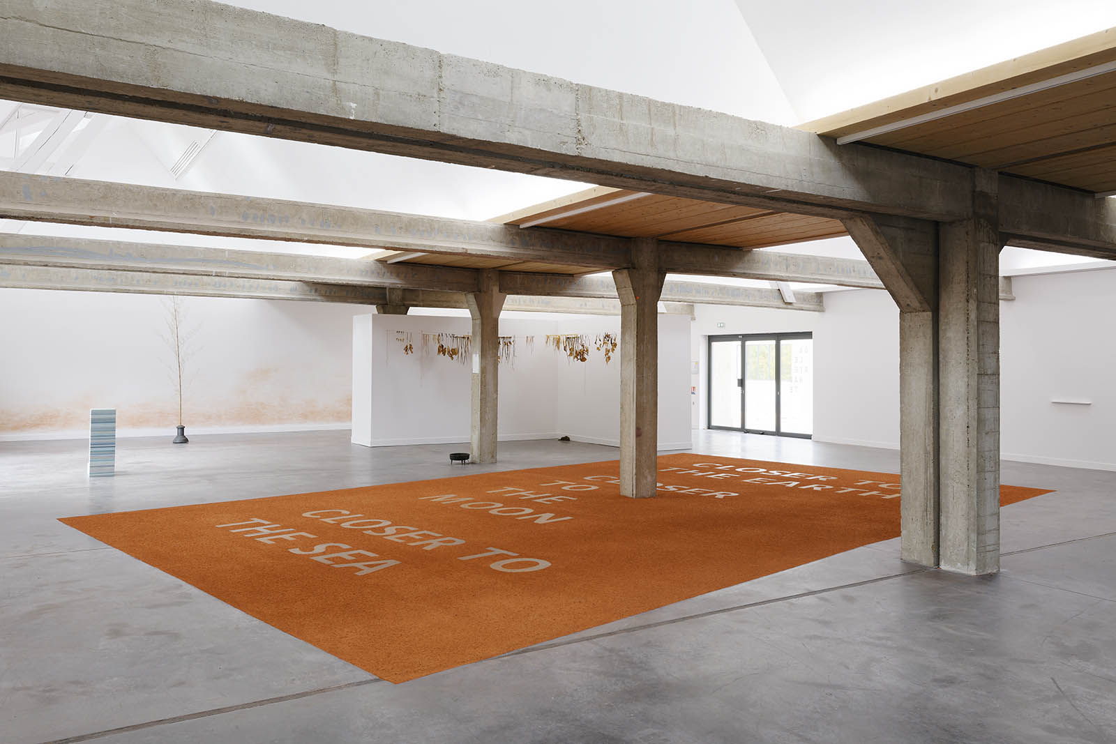 This work consists of red dust produced by crushing tiles from the artist's house, covering the ground to form a rectangle of variable dimensions, equivalent to the area of the original building. Words appear in negative, at the center of this rectangle, as if it were a monumental book page, scaled to the size of the architecture. The installation continues to evolve throughout exhibitions.