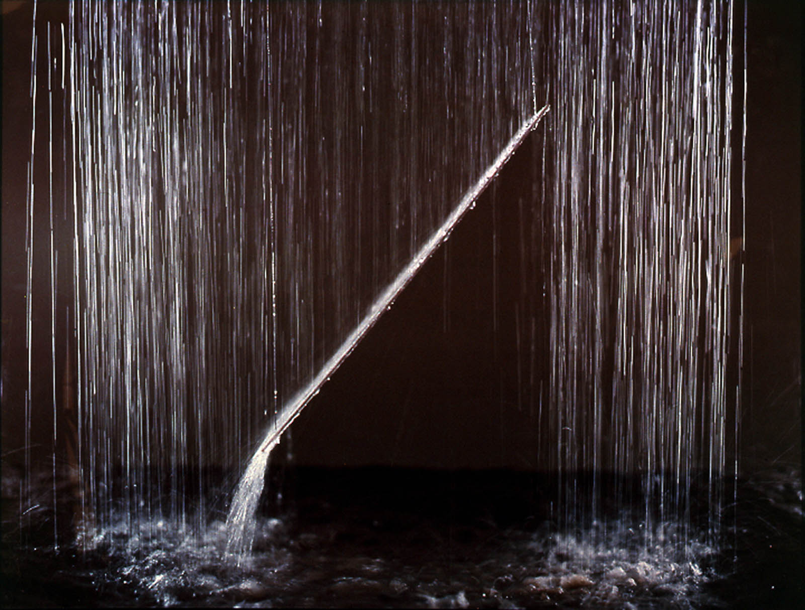 Tosani's La pluie barre and La pluie seule suggest within the same series two distinct forms of temporality. La pluie seule highlights a diaphanous curtain of an isolated downpour, separate from the rest of the world, where the unadorned flow seems to evoke the capture of an absolute moment. La pluie barre presents the same artificial rain intersected by a transversal punctuation mark, drawing the viewer's attention to their point of collision. In this alternation, the artist confronts typographic writing with photographic immediacy to question their value in transcribing time and space. Patrick Tosani remarks: "This rain signifies the flow of time channeled into the space of the image. It is a spatial writing scrolling like a film. This scrolling is marked by material punctuation that disrupts the flow's trajectory. It is the punctuation of time."