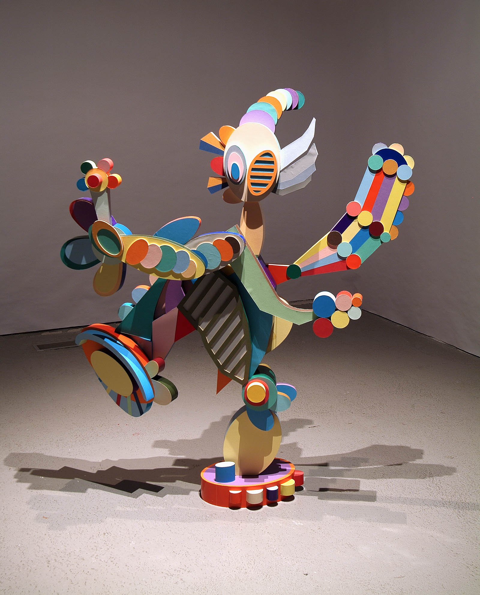 Hugues Reip practices, in his visual works, a kind of visual equivalent of concrete music, always working more or less with found images, sounds, objects, or texts. Toon is a three-dimensional creature but without relief, an accumulation of strips, disks, and other graphic signs that together form a catch-all figure, like an image suffering from a glitch or screen freeze. This is another way for Reip to play with contemporary images and makeshift means.