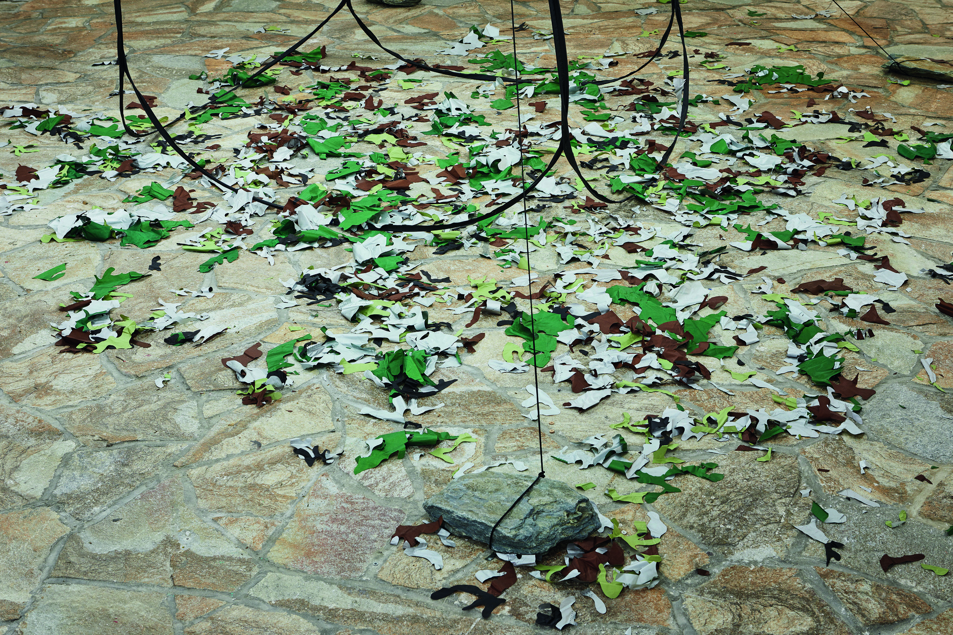 Le maquis subtracts the camouflage pattern from everyday objects (bags, tents, vehicles...). Once the pattern is removed, the naked structure of the object remains. It represents camouflage through emptiness. This work presents variations based on different camouflage types (US M81 Woodland, Daguet, Flecktarn, Razzle Dazzle, Universal Camo, GhostCamo, among others) and the structures used (tent, poncho, umbrella...).